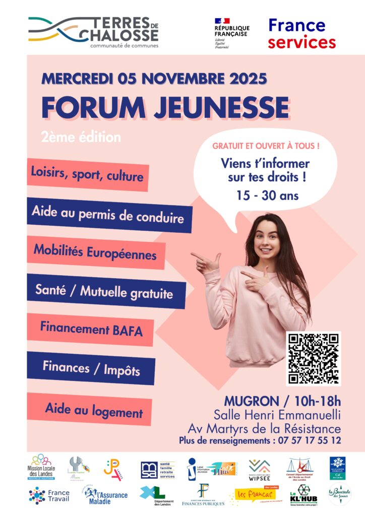 Loisirs, sport, culture, mobilité, santé, finance, aide au logement, la 2ème édition du Forum Jeunesse (15-30 ans) se tiendra ce mercredi 5 novembre salle Henri Emmanuelli à Mugron. Carine Campistron, coordinatrice à France Services, nous détaille les 15 ateliers proposés à l’occasion de ce rendez-vous en partenariat avec la communauté de communes Terres de Chalosse.
